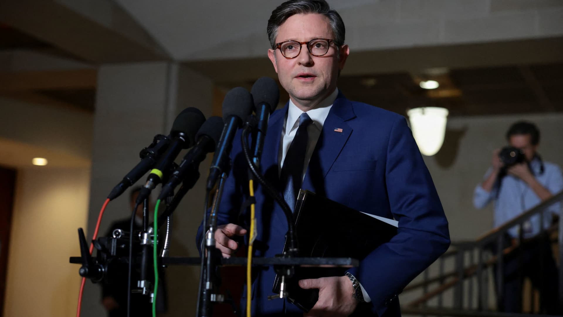 House Speaker Mike Johnson (R-LA) speaks to the media before a secure briefing on U.S. action in Venezuela, at the Capitol in Washington, DC, U.S., January 5, 2026.